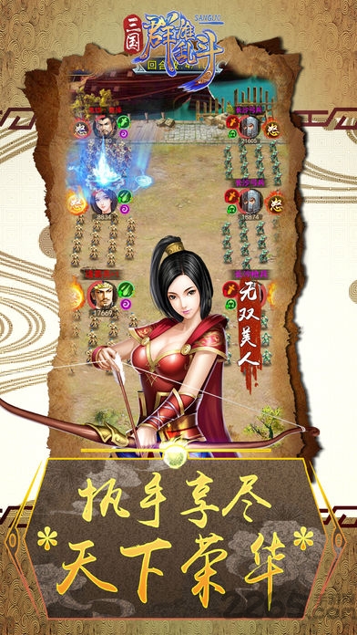 游戲?qū)嶋H采用了以三國為背景的資料,在這群雄逐鹿的時代數(shù)十個特色的武將、豐富的劇情系統(tǒng)。優(yōu)美的人物場景特色圖,通過恢弘壯闊的時間觀,世界觀背景,向人們展現(xiàn)了一個烽火連天的三國亂世,群雄崛起。天下大勢,主權(quán)盡顯。王權(quán)的大門正在向你開啟。