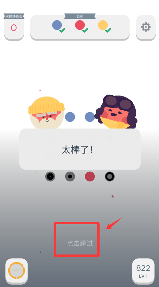 3、恭喜你過關(guān)了,太棒了,點擊跳過并繼續(xù)。
