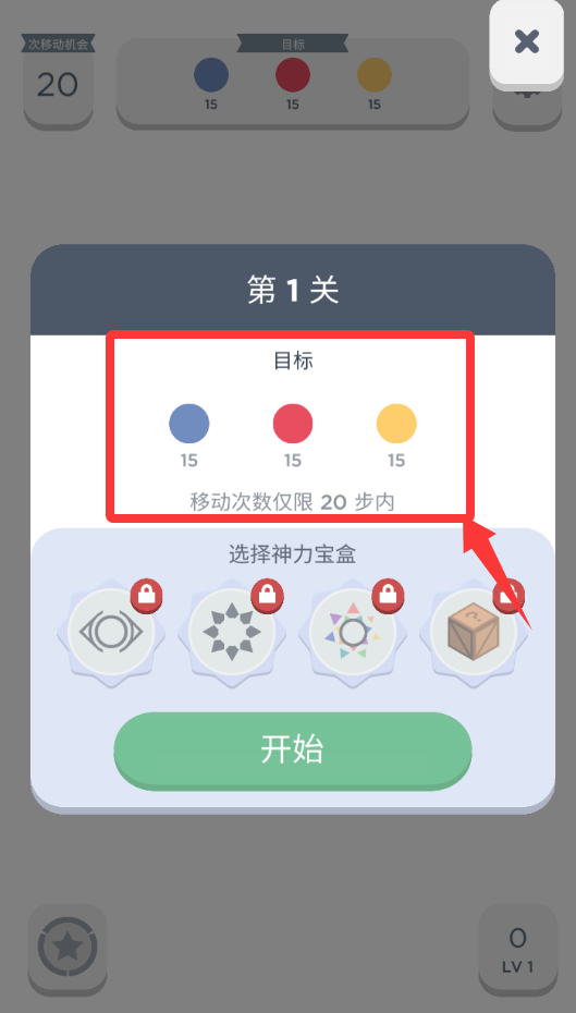 2、進入游戲里的關(guān)卡1,這關(guān)的目標是消滅這3種顏色的數(shù)量就可以通關(guān)。
