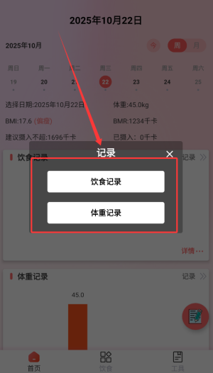 1、通過(guò)首頁(yè)功能可記錄每日飲食攝入情況與體重變化數(shù)據(jù),形成健康檔案。
