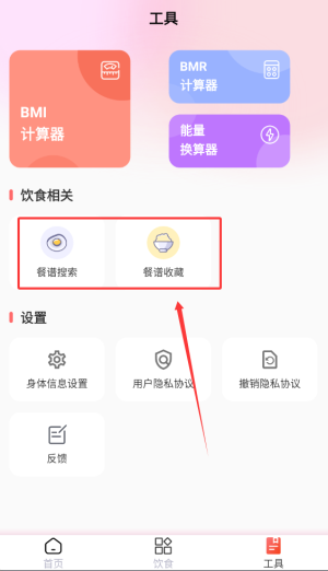 4、工具區(qū)同時(shí)支持菜譜檢索及個(gè)人收藏管理,便于隨時(shí)查閱健康飲食方案。