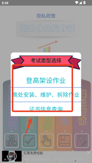 1、選擇考試類型與題庫,打開app后先選擇你需要考取的具體證書類型,然后進入對應(yīng)的題庫開始練習(xí)。