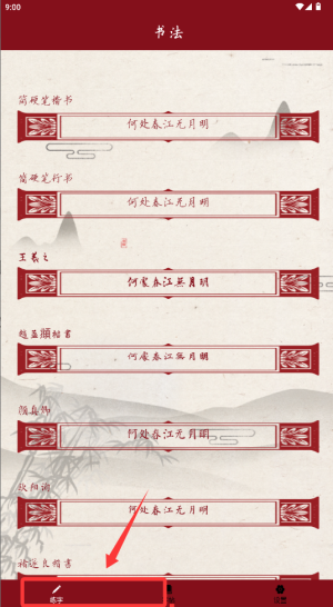 1、打開(kāi)軟件后,可以先從楷書(shū)、行書(shū)等不同字體中選擇你喜歡的風(fēng)格進(jìn)行臨摹,跟著模板一筆一畫(huà)練習(xí)基礎(chǔ)筆畫(huà)。