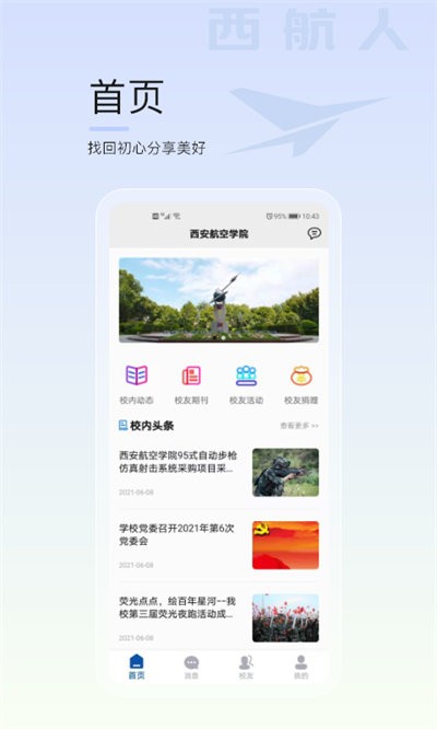 西航人app是一款為西安航空學(xué)院打造的校園資訊軟件,用戶可以在軟件內(nèi)查看到最新的校內(nèi)新聞,對(duì)校園的動(dòng)態(tài)消息實(shí)時(shí)進(jìn)行掌握,各種校友活動(dòng)也會(huì)在里面進(jìn)行分享,加入校友會(huì)與更多的西航校友共同交流,有需要的朋友就快來(lái)下載吧!