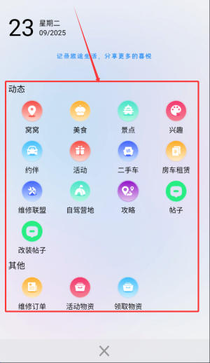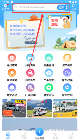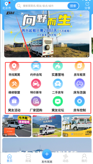 2、首頁提供約伴自駕、房車租賃及高性價比營地等實用版塊,方便規(guī)劃行程。