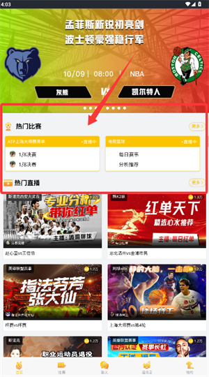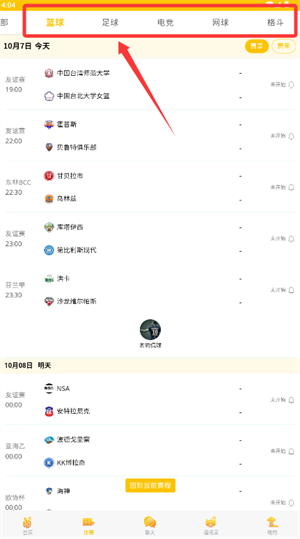 2、切換至比賽頁面,可通過籃球、足球等分類標(biāo)簽篩選賽事項(xiàng)目。
