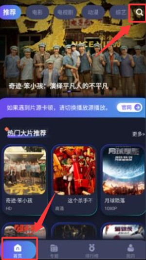 1、進(jìn)入首頁使用頂部搜索功能查找影片,或?yàn)g覽熱門推薦欄目。
