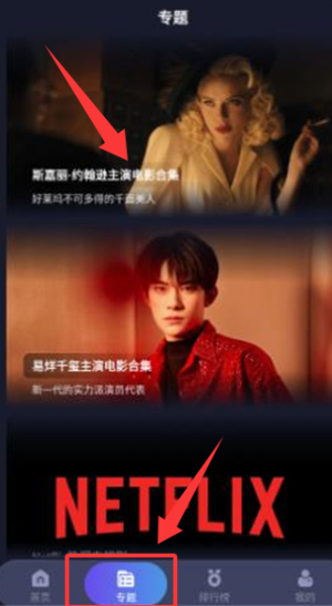 2、選擇專題頁面查看演員電影合集等主題內(nèi)容,點(diǎn)擊感興趣專題。