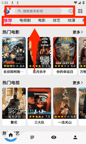 1、在首頁頂部通過搜索欄查找影片,或瀏覽推薦與電視劇分類。