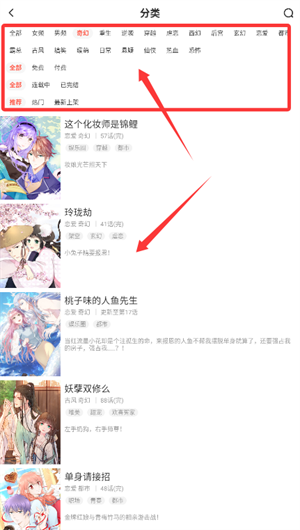 1、啟動應(yīng)用進(jìn)入分類界面,根據(jù)偏好選擇題材類型并瀏覽對應(yīng)作品列表。