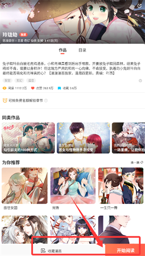 2、確定漫畫后進(jìn)入詳情頁,查看作品介紹與推薦內(nèi)容,點擊閱讀入口。