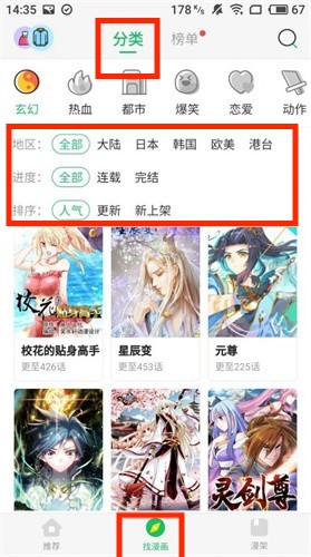 2、通過找漫畫的分類功能,按地區(qū)或進(jìn)度等條件篩選目標(biāo)內(nèi)容。