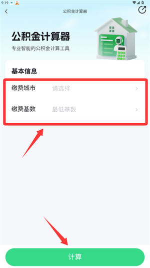 4、進入公積金計算頁面選擇參保城市并設置繳費基數(shù),點擊計算獲取結果。