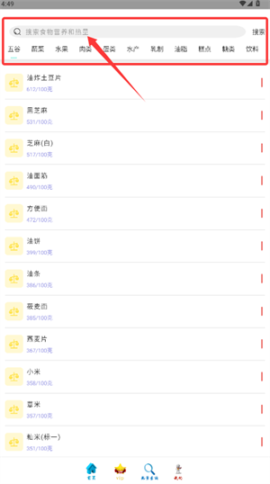 1、點(diǎn)擊“開始減肥吧”按鈕,即可進(jìn)入包含多種食品分類與搜索欄的查詢界面。