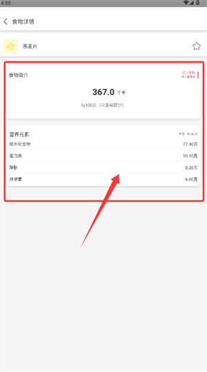 3、選定食品后進(jìn)入詳情頁面,可查閱其熱量及碳水化合物等具體營養(yǎng)成分。