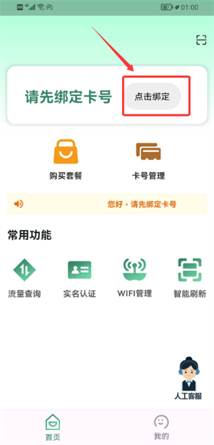2、進(jìn)入首頁后,輕點(diǎn)“點(diǎn)擊綁定”按鈕,跳轉(zhuǎn)至卡號綁定操作界面。