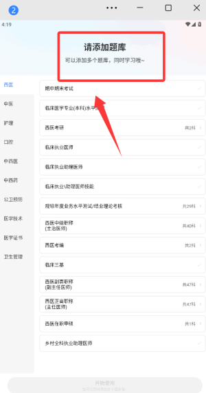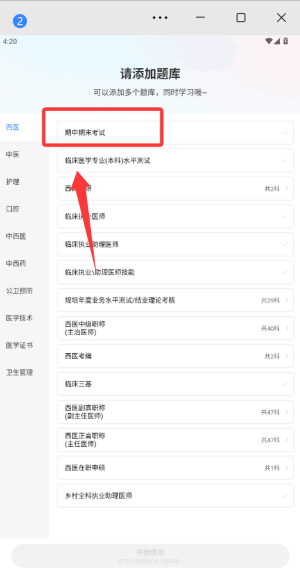1、下載藍(lán)基因醫(yī)學(xué)題庫(kù)app并注冊(cè)登錄,進(jìn)入主界面后選擇你需要的醫(yī)學(xué)考試類別開(kāi)始學(xué)習(xí)。
